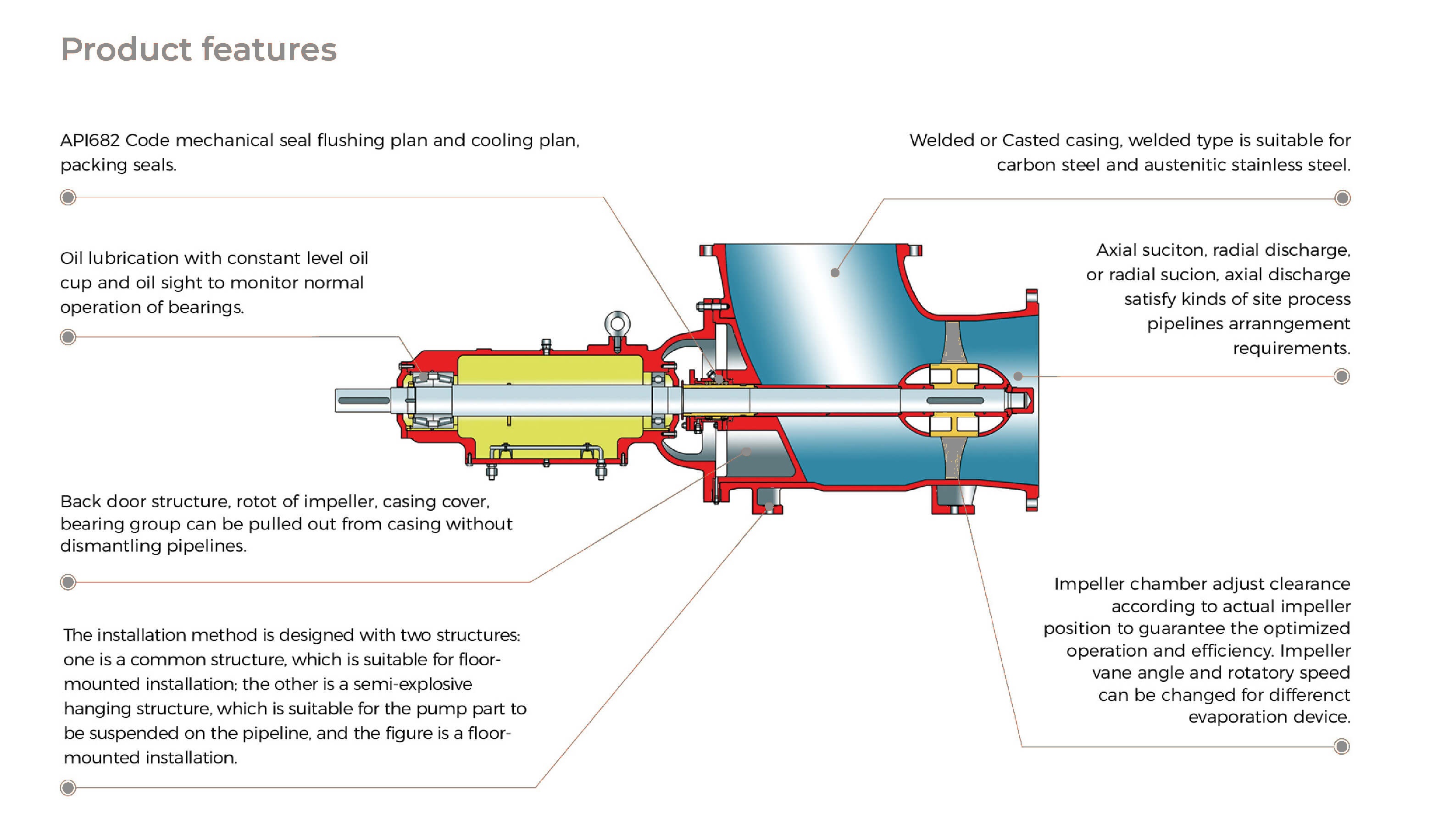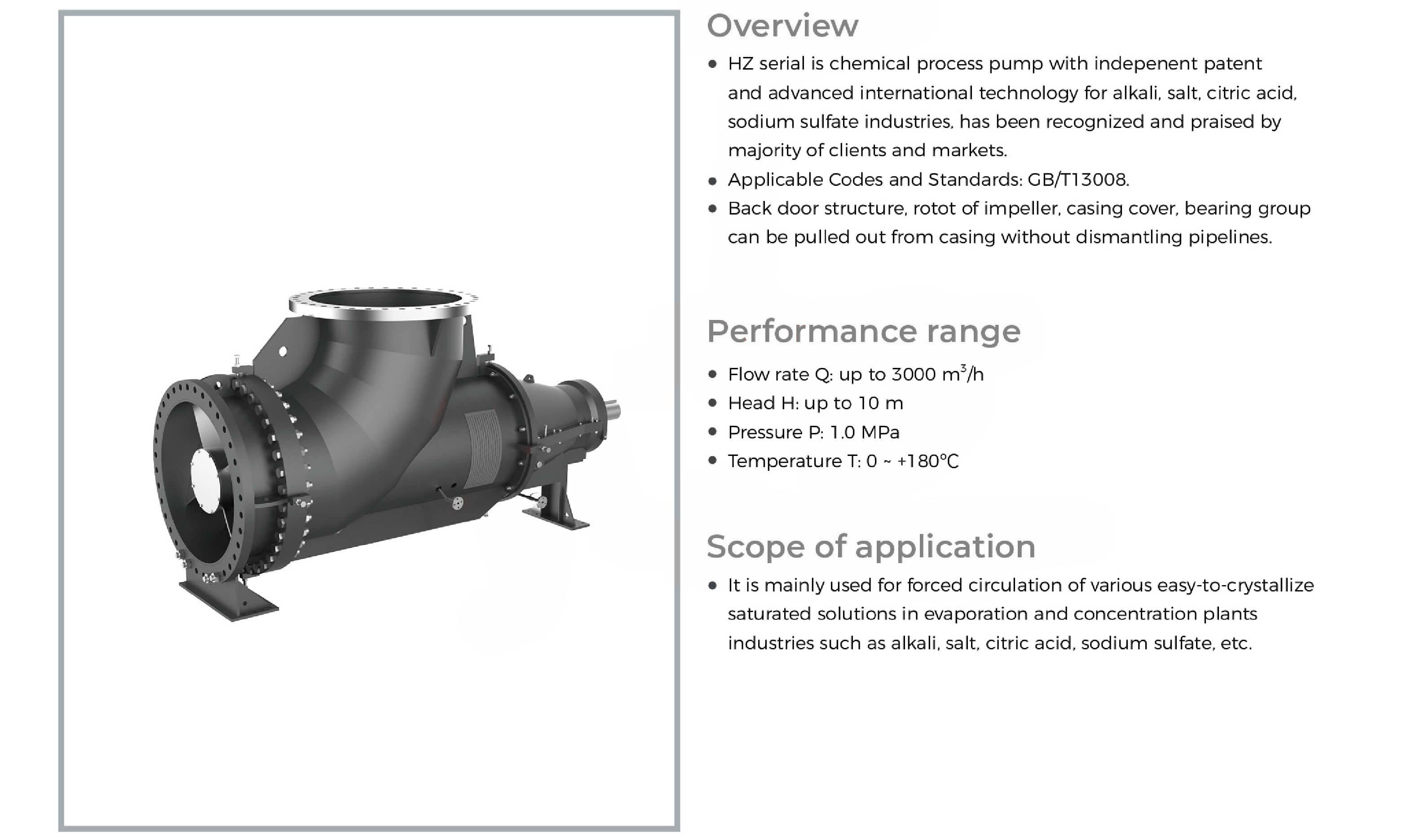 HZ series axial flow pump is developed by our factory according to the characteristics of alkali making, salt making citric acid, sodium powder and other industries, referring to the advantages of foreign advanced products, and has reached the advanced level of similar foreign products, the product has been recognized and praised by the majority of users since it entered the market. The rear door structure, composed of impeller, pump cover and bearing box rotor parts, can be extracted from the pump body, do not need to remove the inlet and outlet pipeline, easy to maintain.