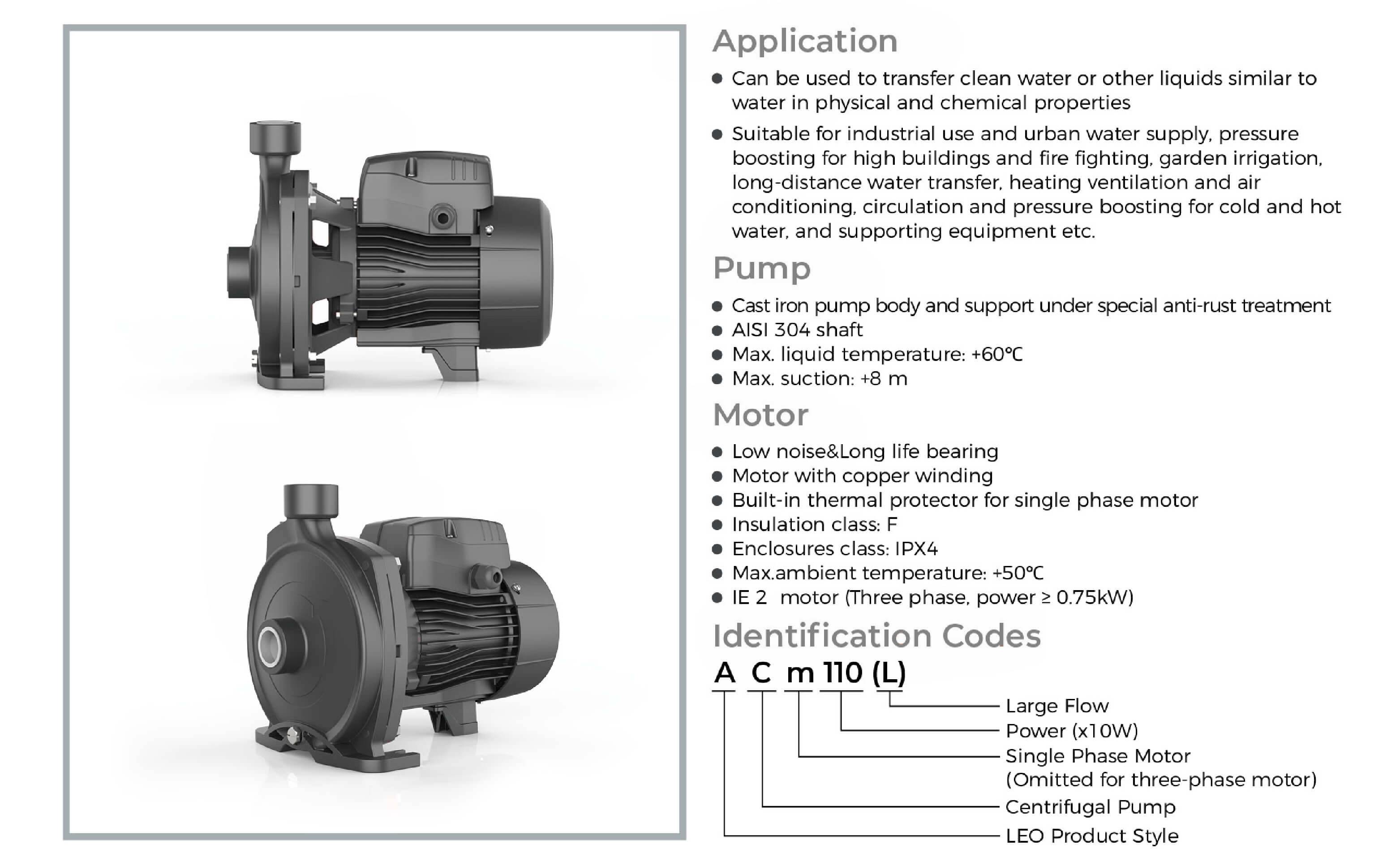 • Suitable for industrial use and urban water supply, pressure boosting for high buildings and fire fighting, garden irrigation, long-distance water transfer, heating ventilation and air conditioning, circulation and pressure boosting for cold and hot water, and supporting equipment etc.