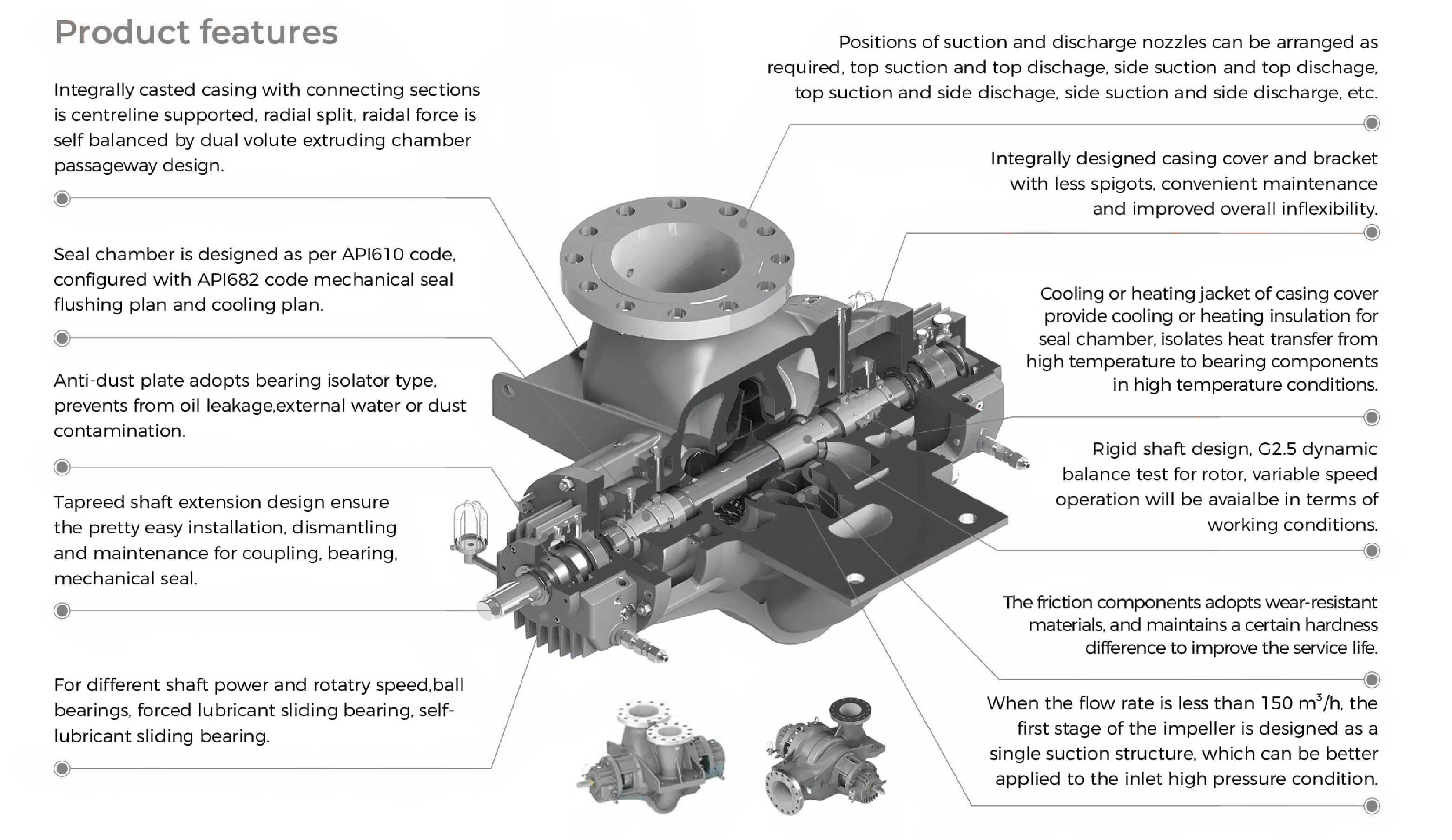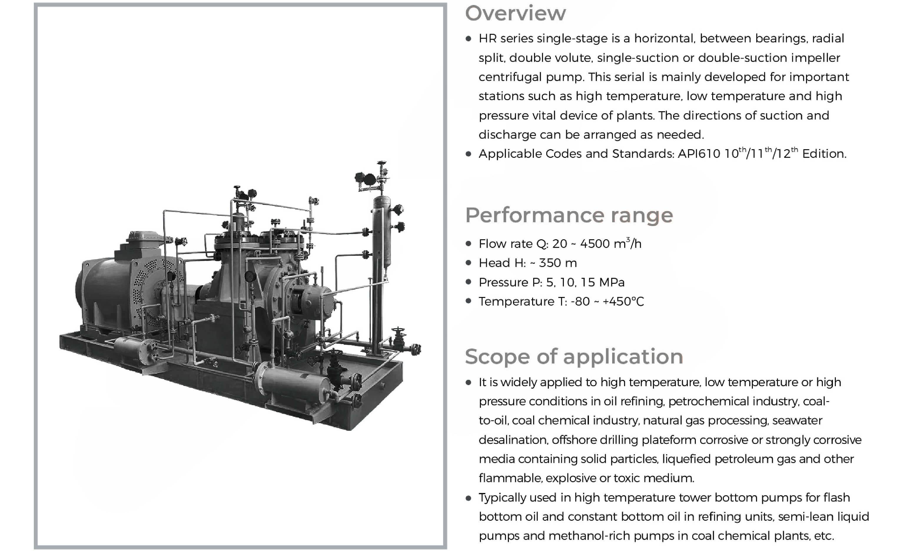 HR Series pump is horizontal, between bearing support, radially split, double volute, single stage, double stages or 3 stages, single stage single suction or double suction centrifugal pump. The pump type is mainly for all kinds of equipment in the high temperature, low temperature, high pressure and other important station development of centrifugal pump, according to the device pipeline demand arbitrary choice of pump inlet and outlet direction.