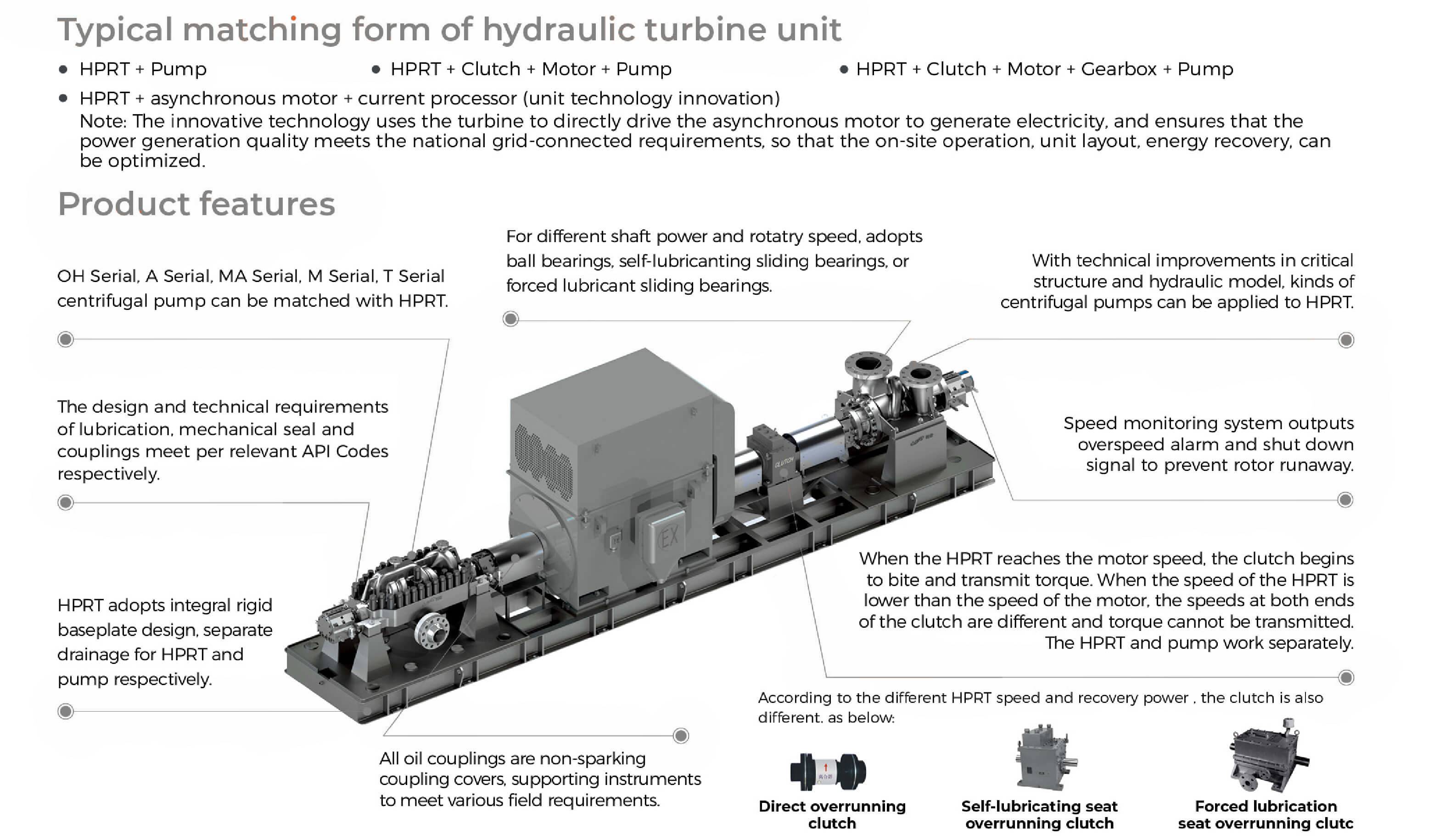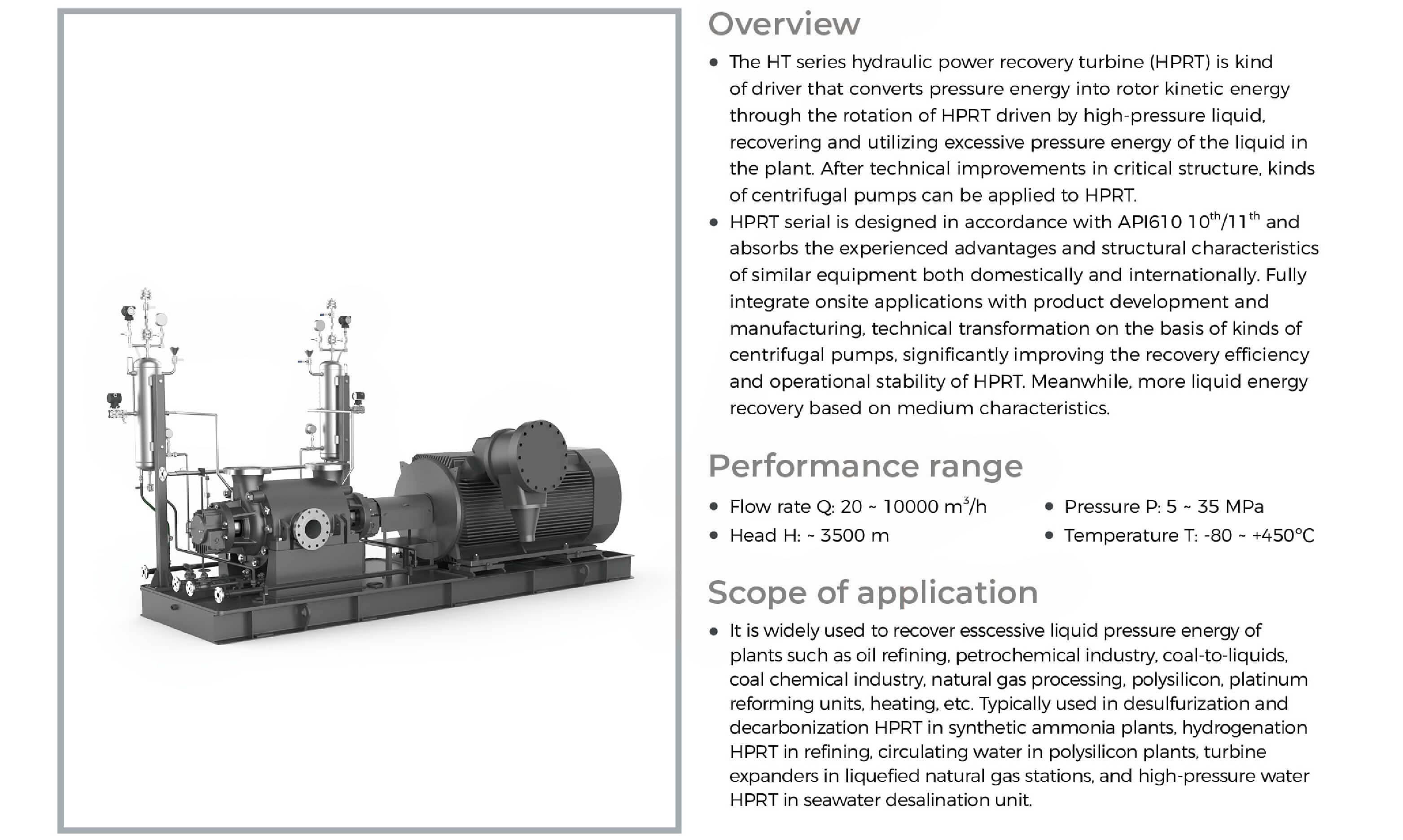 HT series hydraulic power recovery turbine through high pressure liquid driven turbine rotation to convert the pressure energy into the rotor kinetic energy driving equipment, so that the liquid in the device rich pressure can be recycled. All kinds of centrifugal pumps can be reformed into HPRT after the technical improvement of key parts.