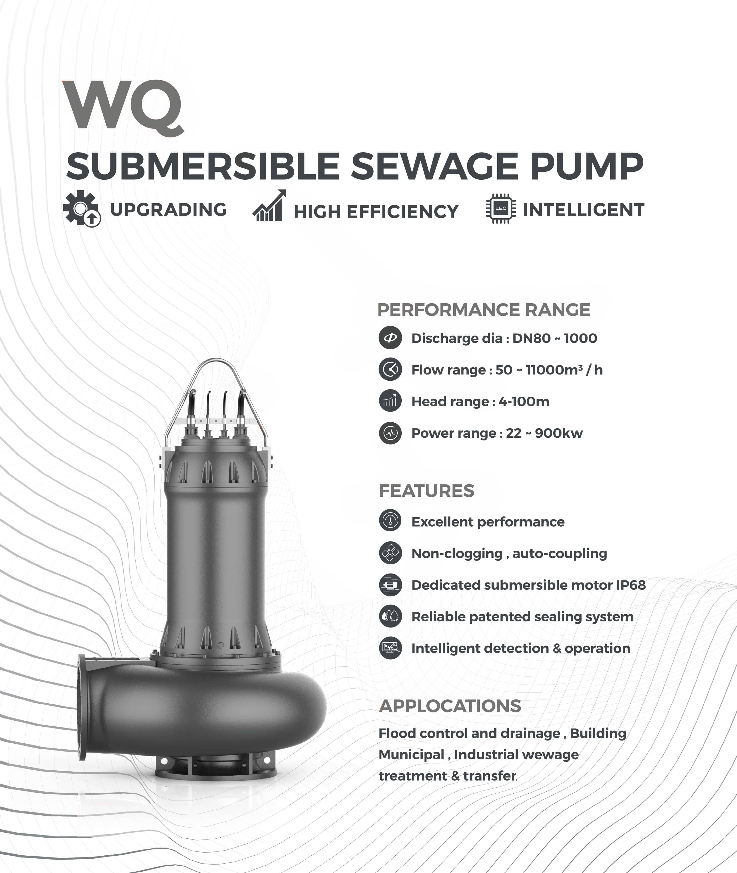The WQ series submersible sewage pump is the third generation of high efficiency and energy saving non-clogging submersible sewage pump that our company has developed and innovated on the basis of extensively absorbing the advanced technology of similar products at home and abroad. There is innovative and optimized design in hydraulic performance, special submersible motor, product appearance, mechanical strength, sealing system, cooling system, intelligent protection, control system, etc.